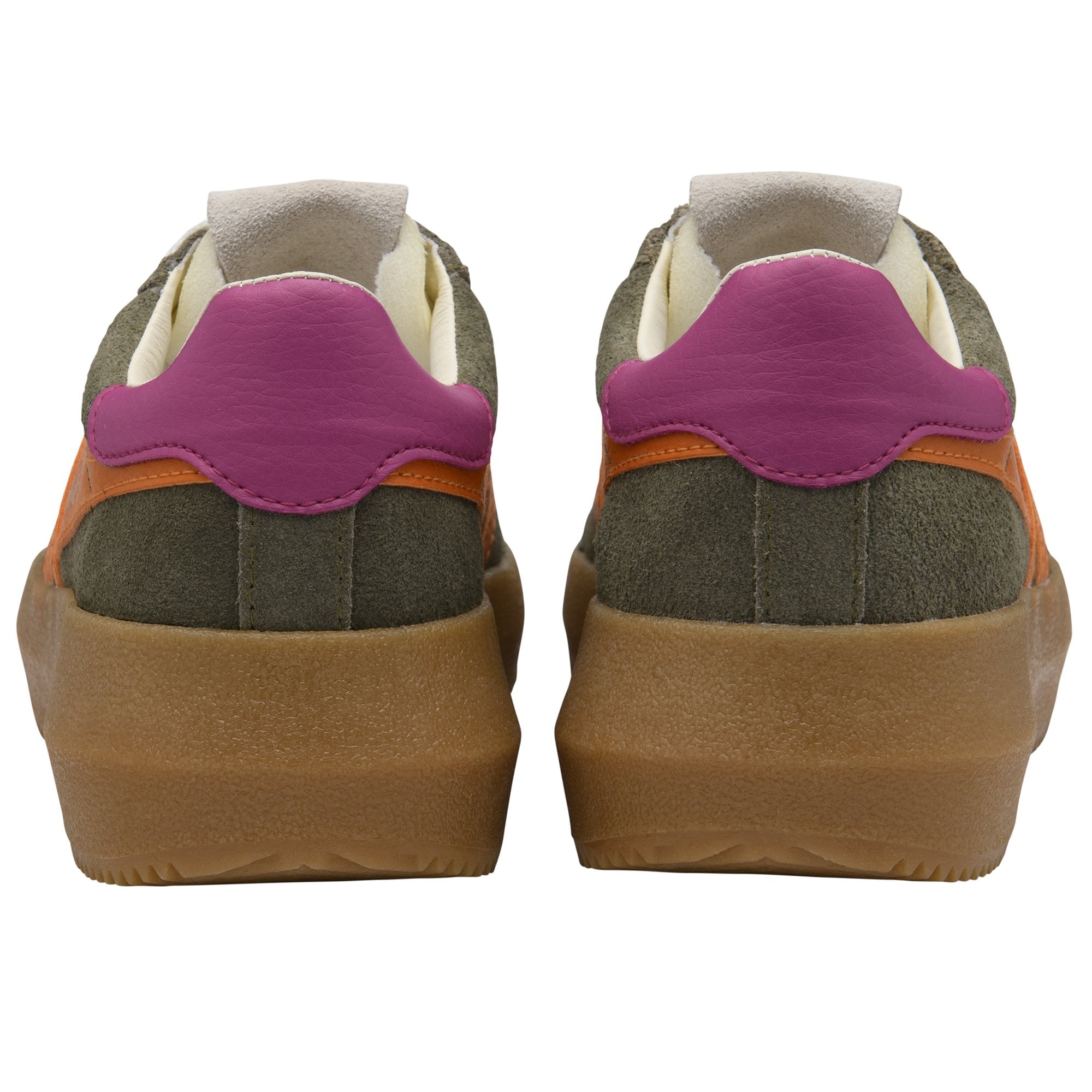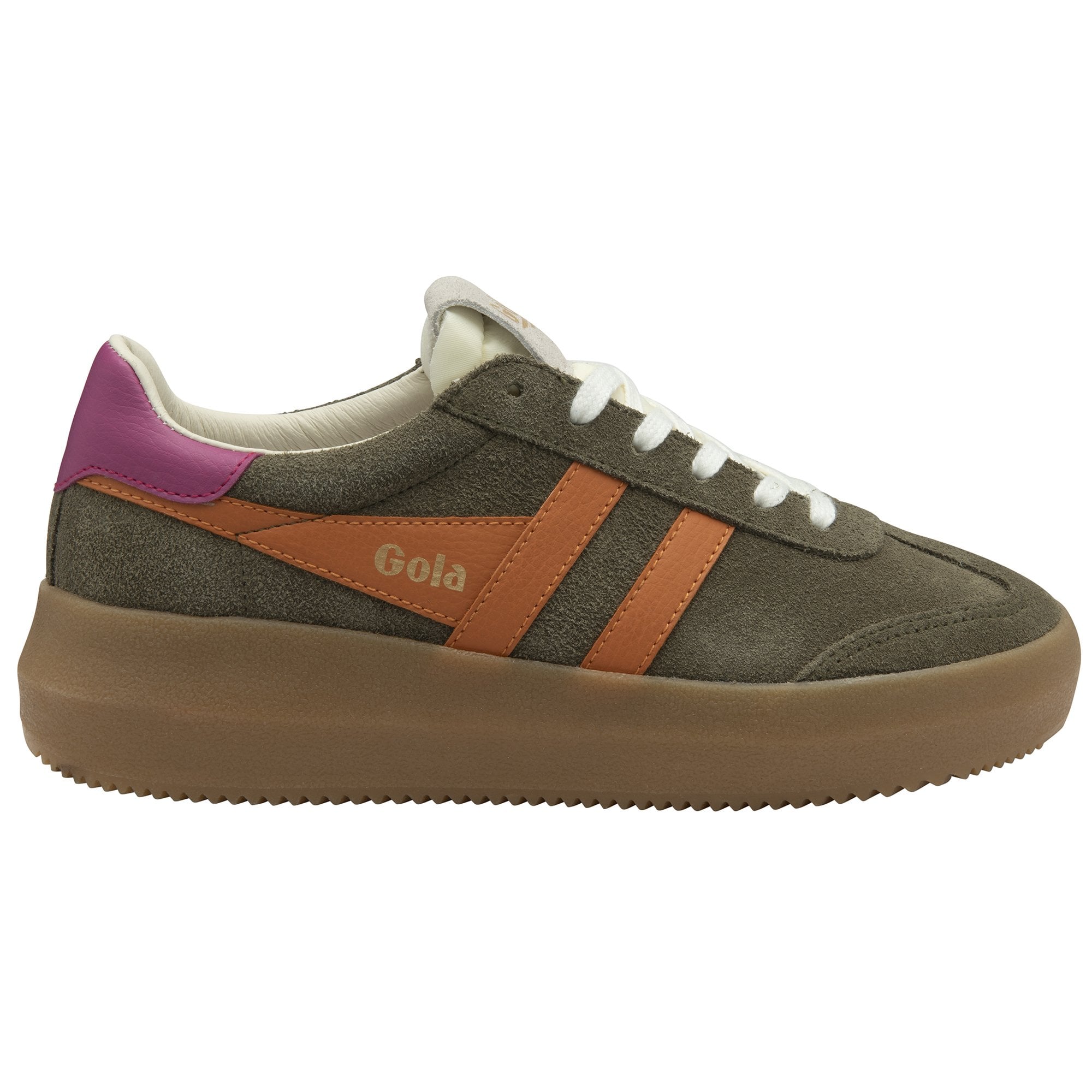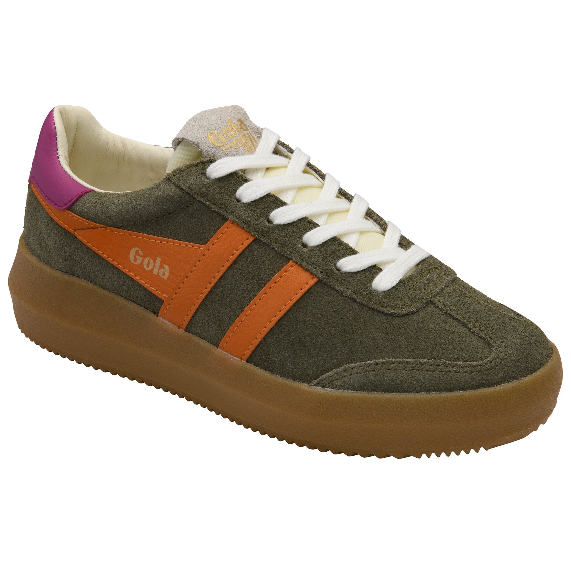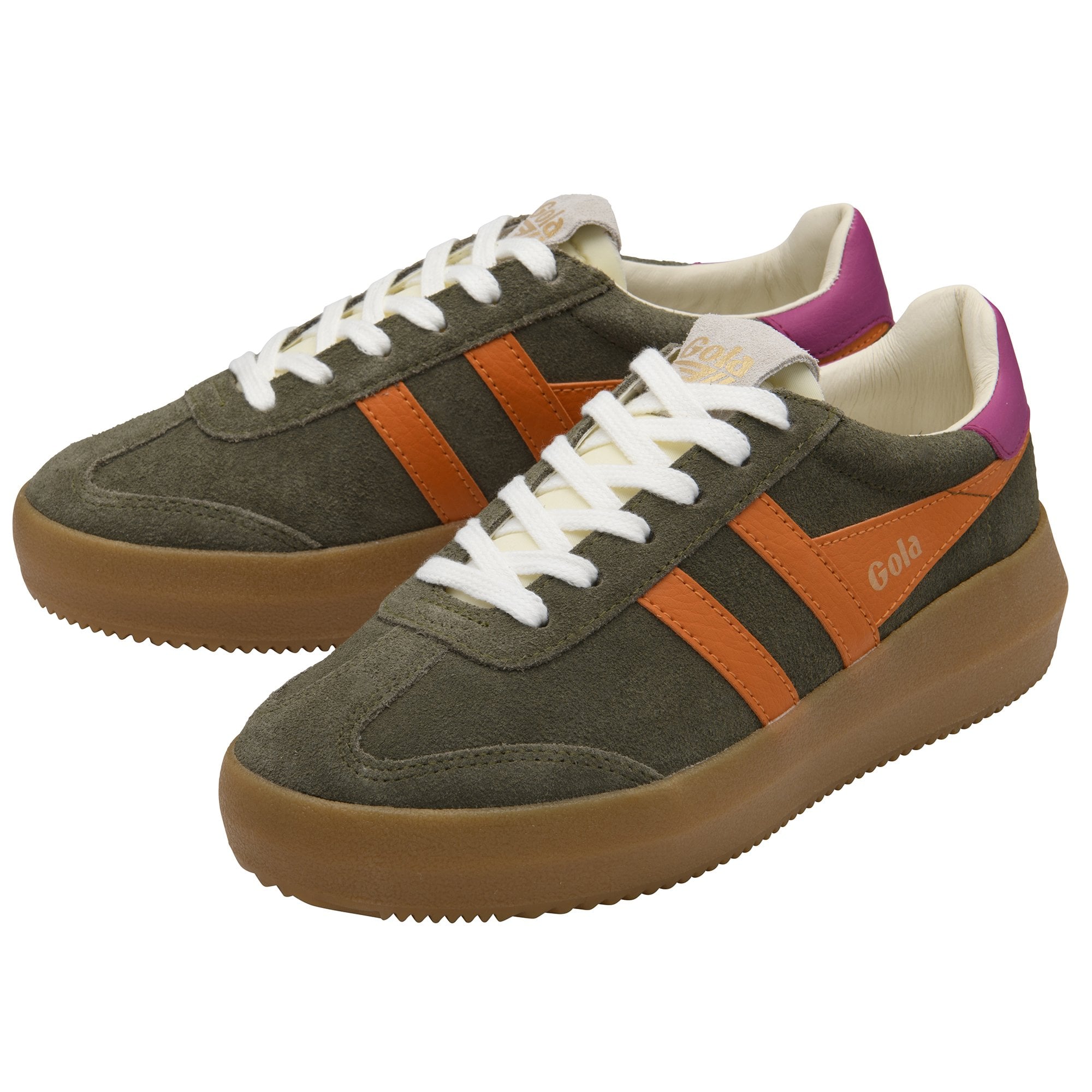 Up daytime trainer looks with Gola Athena. With its elevated sole, Gola Athena is both a versatile and super stylish women’s footwear choice; dress up or down. An extensive suede upper colour palette means you can choose a tonal or colour clashing option to suit your wardrobe vibe, featured here in khaki, clementine and fuchsia.
