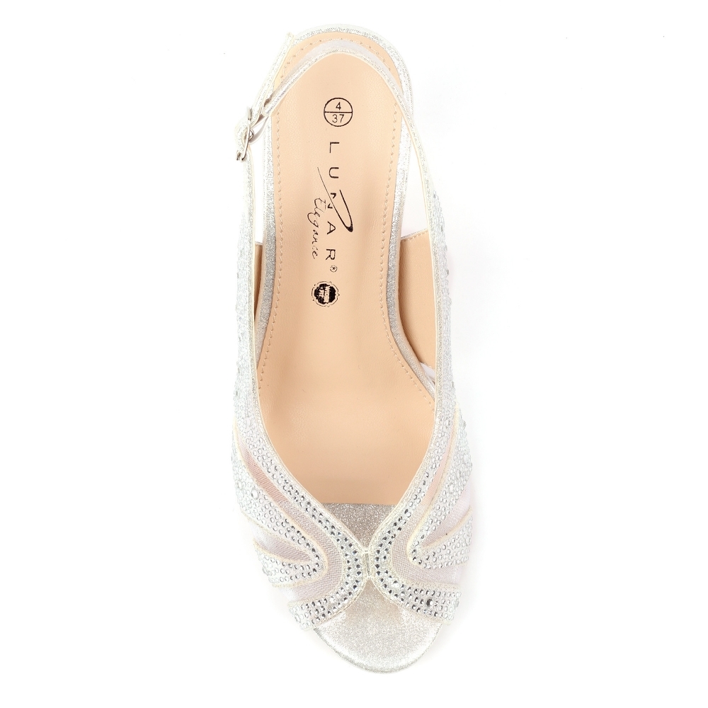 Step into evening elegance with the Nancy Wide Fit shoe. Designed with sparkling embellishments, this slingback heel offers both glamour and comfort. Finished with mesh panel detailing for a touch of sophistication, it’s the perfect choice for weddings, formal dinners, and special occasions.